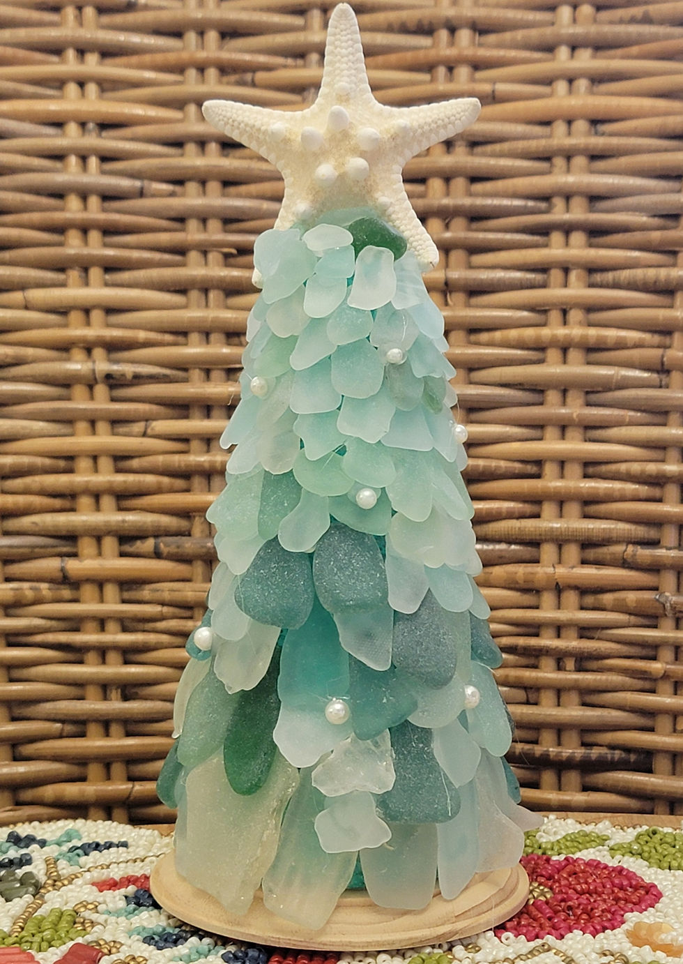 This 7" genuine seaglass tree is spectacular! It contains over 100 pieces of green and seafoam colored seaglass treasures found from beachcombing the most beautiful beaches in the world. Your tree may be left out all year and or decorated it with tiny lights during the holidays. The natural seastar just makes this keepsake extra beachy!